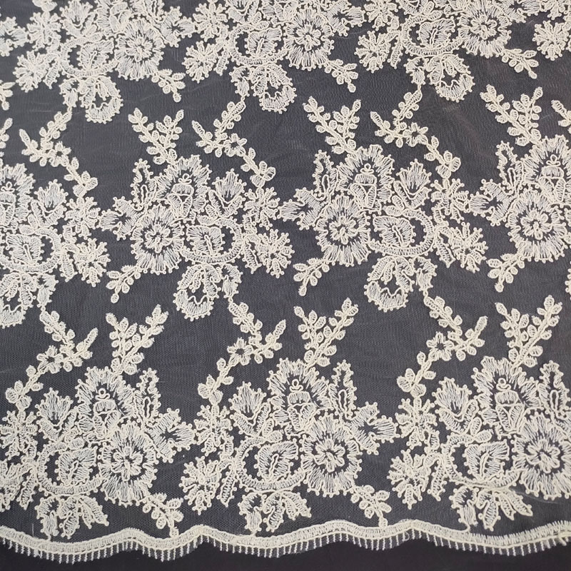 - Product description: Shop wholesale embroidered mesh French lace fabric, perfect for creating elegant, intricate party dresses. Features delicate floral embroidery and premium mesh base.